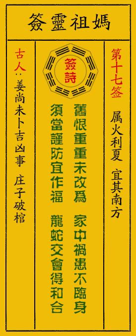 | 解曰 | 讨海:微利运不辰。 作塭:运不合求小利。 鱼苗:微利。 求财:轻微勤俭必得。 耕作:平平小利。 经商:平平忠直能得。 月令:不畏渐渐平安。 六甲:先男后女。 婚姻:成者大吉。 家运:居之则安。 失物:难寻。 寻人:待时。 远信:慢。 六畜:纳者不可。 筑室:有犯阴邪。 移居:随意不可。 坟墓:平平小吉。 出外:辰己日可。 行舟:平平财轻。 凡事:人害紧和无事。 治病:求神庇佑辰未日过渐愈。 作事:先难后易。 功名:修阴德必中。 官事:和为贵不和凶。 家事:和为贵。 求儿:不可。 |