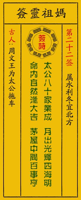 | 诗曰 | 太公八十家业成、月出光辉四海明、命内自然逢大吉、茅屋中间百事亨。 |